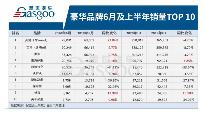 豪华品牌上半年销量TOP 10:一线整体走跌,二线两席增长