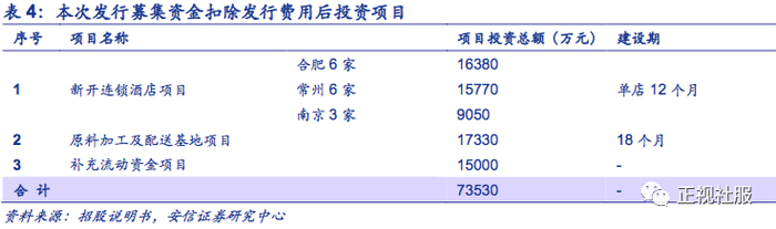 上市募集资金加速推进门店扩张,进一步提升品牌影响力。本次发行共募集资金7.35亿元,将用于:新开连锁酒店项目、原料加工及配送基地项目、补充流动资金项目。