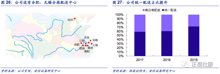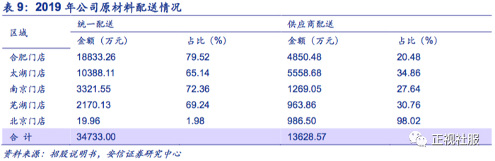 设有合肥、无锡两大分拣中心,发挥集中采购优势,降低采购成本,保证原材料质量。公司设采购部,所有原材料由公司统一采购,门店没有采购权。门店按计划向分拣配送中心提交采购申请,分拣配送中心汇总原料采购申请,提交公司采购部统一采购。批量采购的配送方式包含两种,一是供应商配送至总仓、分拣配送中心,总仓、分拣配送中心根据门店所需统一配送至各门店;二是供应商直接配送至门店。自2016年下半年起,公司在合肥、无锡两个区域设立生鲜原材料集中分拣配送中心,其中,合肥区域分拣配送中心为公司合肥、安庆、芜湖、南京市区门店分拣配送原料,无锡区域分拣配送中心为无锡、常州、苏州门店分拣配送原料。