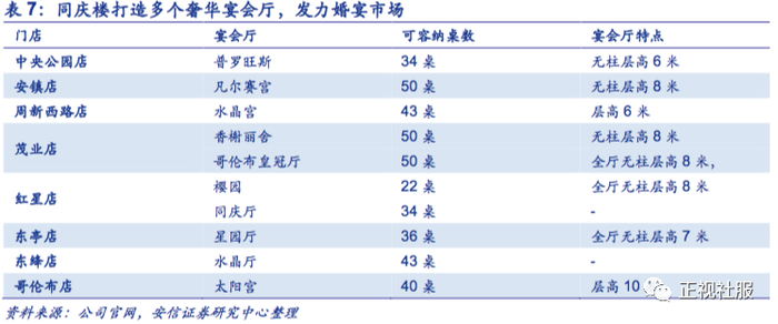 公司可承接多种宴会需求,业务天花板高。公司的豪华宴会厅与成熟的婚宴管理有助于公司运营其他宴会需求,顾客在同庆楼不仅可以举办婚宴,宝宝宴、升学宴等各种宴会需求同样可以得以满足,有助于提升公司中大型宴会业务体量,提高宴会厅利用率,增厚门店业绩。