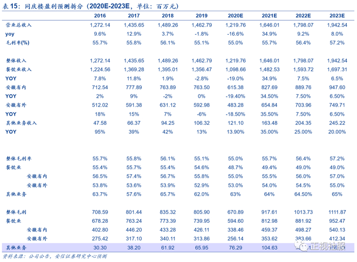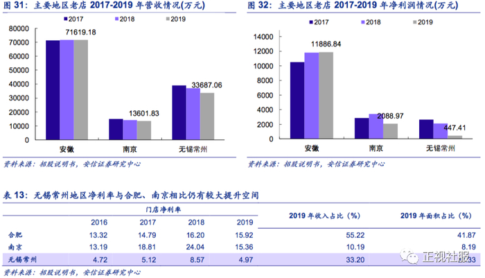 公司省外老店(2017年以前开设)营收稍显疲软,依赖新店开设扩大营收。公司安徽省内老店具有地域优势,口碑、生产等优势明显,营收稳中有增,2019年省内老店净利润上升至1.19亿元;省外老店营收稍显疲软,南京、无锡、常州等主要业务地区老店营收持续下降,主要系部分门店内部改造所致,同时公司需要依靠开设新店打开营收天花板。