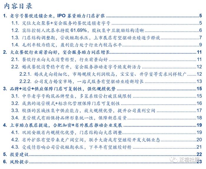 ■品牌+运营+供应保障门店可复制性,老字号门店扩张具备良好基础。公司门店全直营模式下,先已打造出较强的区域性品牌影响力、门店运营能力及规模采购优势,使得公司相比普通中餐厅,在新开店的成功率上有望更优。1)品牌:同庆楼为“中华老字号”品牌,全国仅56家餐饮企业获此殊荣,安徽地区仅8家,具备一定稀缺性;2)运营:从前厅服务到后堂出品再到内部管理,公司已形成一套成熟的运营模式。目前门店共计57家,新店多数1年左右可达到盈亏平衡;丰富的门店管理经验及较强的运营能力,使得公司具备较稳健的复制性;3)供应链:公司设有合肥、无锡两大分拣中心,所有门店原材料由公司集中采购、配送,最大化规模优势并保证食材质量。本次募资金,公司拟以1.73亿购置初加工生产线、保鲜生产线等设备60台,整合原有分拣配送中心及中央厨房,为合肥各餐饮门店提供原材料集中采购、加工及统一配送,有望降低合肥地区门店的成本和费用,进一步扩大规模效应及门店盈利能力。