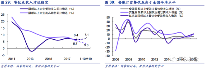 公司核心开店地区安徽和江苏规模化餐饮业发展态势良好。公司门店主要分布于安徽和江苏,2016年以来,安徽和江苏餐饮收入增速均高于全国水平,2018年安徽省、江苏省餐饮收入同比各增长11.8%、9.7%,高于全国9.5%的水平。安徽和江苏规模化餐饮企业表现较全国更为亮眼,安徽省和江苏省限额以上餐饮业餐饮费收入增速2017年起高于全国水平,2018年安徽省和江苏省限额以上餐饮业餐饮费收入同比各增长10.57%、11.60%,与全国增速差距进一步拉大。