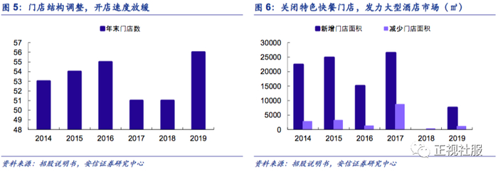 门店扩张支撑营收增长,近年来营收承压,或受经营模式调整影响。2015-2017年公司营收保持较高增速,主要系新开门店影响。2017年以来公司营收增速逐年下滑,或受公司经营战略调整所致,新增门店主要为营业面积较大的门店,减少门店主要为营业面积较小的特色快餐门店,发力大型酒店市场,门店扩张速度放缓。2019年营收同比减少-1.7%,扣非归母净利同比减少-8.2%, 2019年新开店6家,新店开发需要1-2年培育期,新开门店业绩或有望于2020-2021年释放。