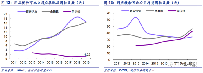 公司应收账款率和存货周转率均高于同行业上市公司。公司应收账款周转能力较强,2019年应收账款周转天数仅为1.02天,远低于同行业上市公司,主要系其他可比上市公司应收账款中除去餐饮消费的客户之外,还有金额较大的商超、租赁客户。公司存货周转能力较强,2013-2019年存货周转天数略有上升,2019年存货周转天数为42.59天,在同行业上市公司处于较低水平。