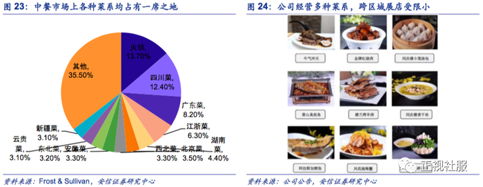 公司经营多种菜系,跨区域展店受限小。中餐市场菜系多样,消费者对菜系的选择跨越地区限制,接受程度日渐提升。跨区域展店的一大难点在于大众对菜系的接受度,公司经营多种菜系,门店经营受区域口味影响较小,跨区域展店空间大。