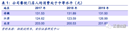 公司定位大众餐饮,市场发展前景广阔。公司作为中华老字号企业,一直有着“价格公道、童叟无欺”的良好传统,公司秉承中华老字号企业的良好传统,提出“大众消费,好吃不贵”的经营理念。定位于大众消费,大众消费不仅体现在价格方面,更是经营选址、就餐环境、商品采购、产品价格等因素的结合。在经营选址方面,公司注重交通便利、适宜停车区域;在就餐环境方面,公司注重装修风格高雅大方;在商品采购方面,公司通过集中采购保证质量并降低生产成本;在产品价格方面,公司注重菜肴定价适中。安徽、江苏门店人均消费为120-130元,北京门店人均消费200元,处于中餐正餐消费中等水平,市场发展空间广阔。