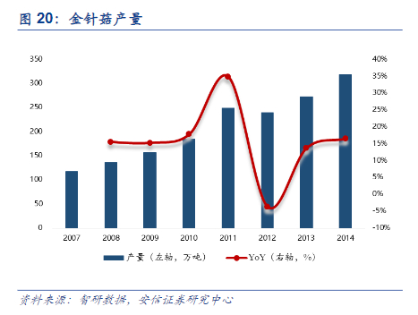 相比之下,香菇虽然需求量更大,但在目前的技术水平下,香菇并不适合工业化生产。据安信证券的草根调研,以我国目前香菇的工业化生产水平来看,工业化生产的香菇质量比不上人工培育的香菇,且由于农村地区人工成本低廉,工业化生产的香菇在成本上也并无优势。