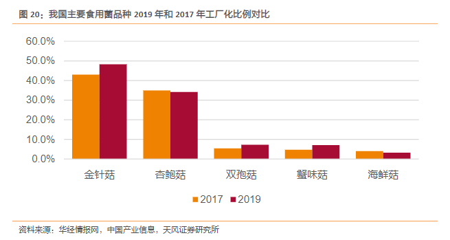 据安信证券的研究,金针菇和杏鲍菇是我国食用菌中工业化程度最高的产品。2019年,全国金针菇的产量为161.94万吨,杏鲍菇产能114.39万吨,2018年,两者的工业化产能占比分别为43.2%和34.9%左右,远高于其他食用菌种。