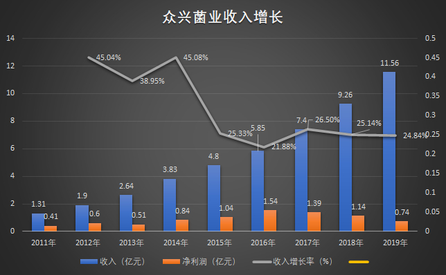 而众兴菌业作为工业化生产金针菇的企业,其发展受益于行业增长和工业化双重因素。近10年来,众兴菌业不断地投建新的食用菌产能,收入一直保持着20%以上的高速增长,增速远超行业平均水平。2019年,众兴菌业收入为11.56亿元,已经接近2011年收入水平的十倍。