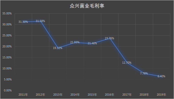 同时,随着产能的不断发展,金针菇的生产量也在越来越接近国内消费需求的天花板,供需差逐渐缩小,甚至在2018年出现了国内金针菇产能已经供过于求的观点。当然,这导致的结果是金针菇的行业整体利润水平不断下滑,从众兴菌业的今年来的毛利率水平可以看出,自从2016年行业增速放缓,其毛利率也出现了大幅下滑。