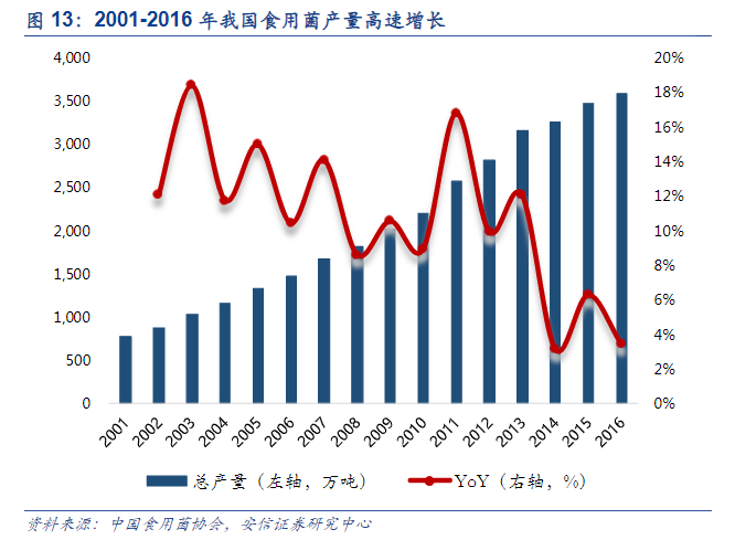 事实上,我国的食用菌行业已经过了高速增长期,目前行业的发展趋于平稳。据中国食用菌协会披露的数据,我国2016年食用菌产量的增速已经下降至3%,远不及2014年的水平。