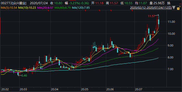 这样的业绩增长或许不如猪肉股那样抢眼,但众兴菌业的股价表现却十分稳健。已经从年初的6.94元涨至10.8元,股价接近翻倍。