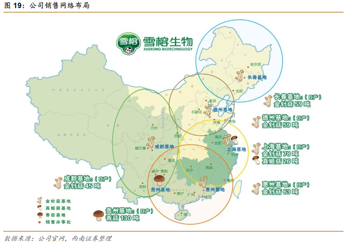 然而,另一家行业龙头雪榕生物的产能布局也遵从了同样的逻辑。经对比发现,众兴菌业的产能布局在地理位置上与雪榕生物的重合度很高,尤其在东北、华东和华中地区的产能尤为接近。