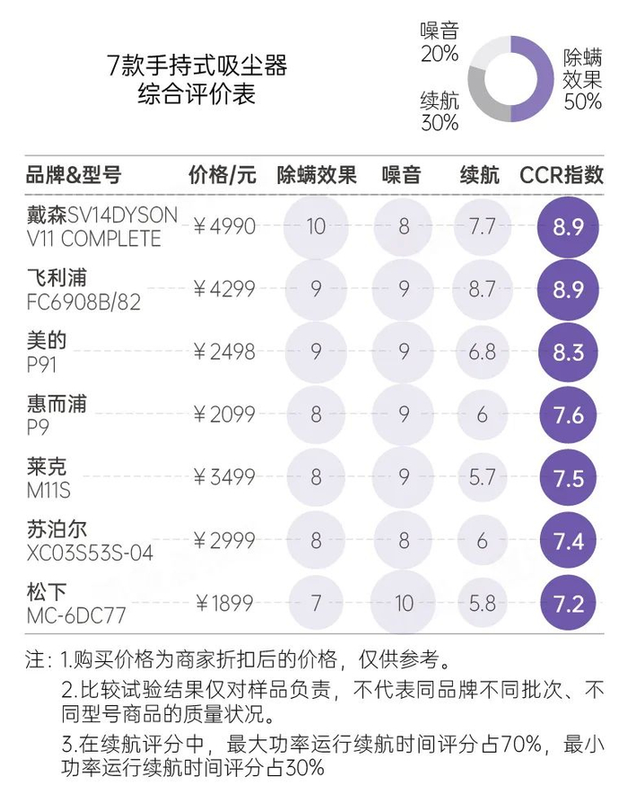 综合除螨效果、续航、噪音这3项指标,得出7款手持式吸尘器的综合评价。