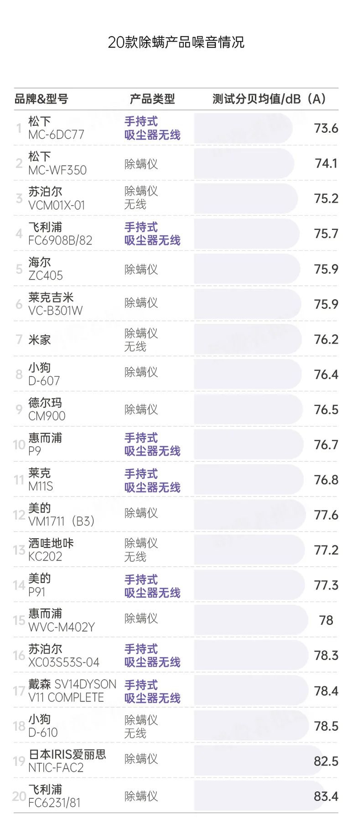 要指出的是,虽然20款除螨产品的最大差距在10分贝左右,但在实际体验中基本感受不到明显差异。