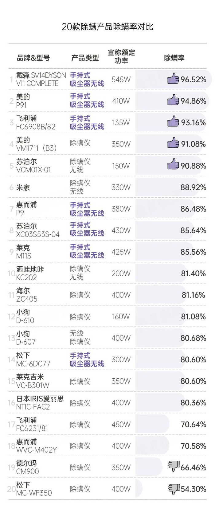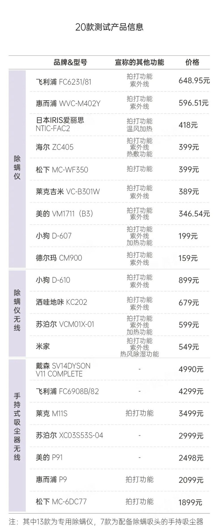 20款除螨产品比较试验:戴森、美的除螨率超过90%;松下表现最差