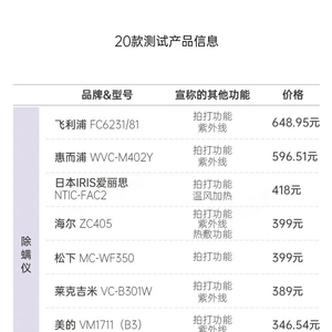 2020年上半年,中国消费者协会参照标准QB/T 5363-2019《除螨机》,对20款除螨仪(器)开展了比较试验。