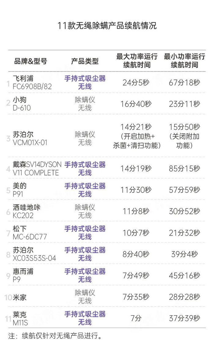 测试结果显示,开启最大功率时,11款无绳样品中,续航能力最好的是飞利浦 FC6908/82,达到24分05秒,远超其他产品。米家、莱克 M11S、惠而浦P9、苏泊尔XC03S53S-04均低于9分钟。