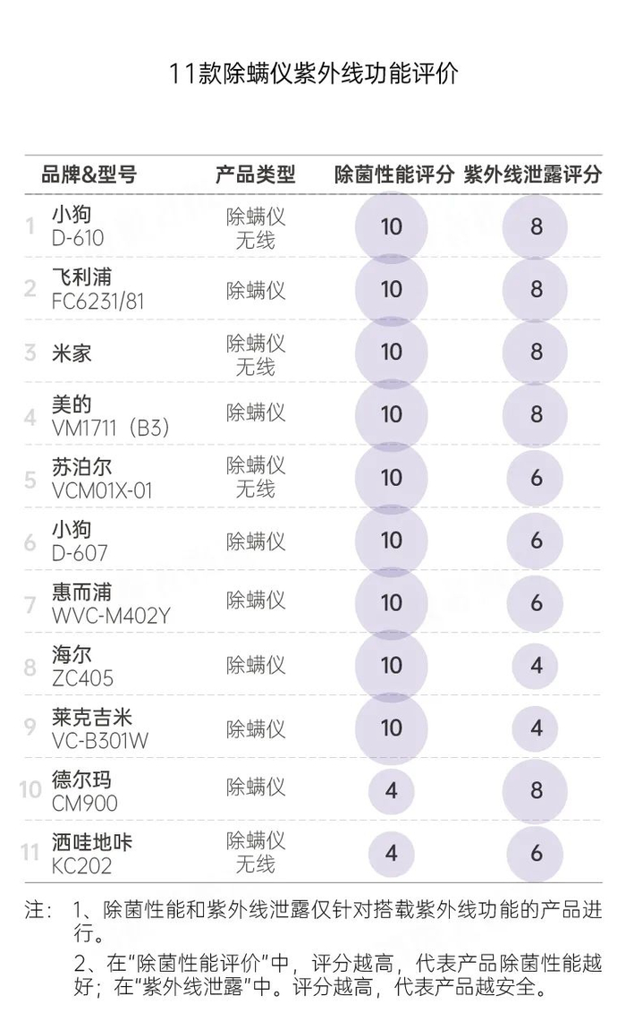 除螨效果、噪音、续航、除菌性能、紫外线泄露