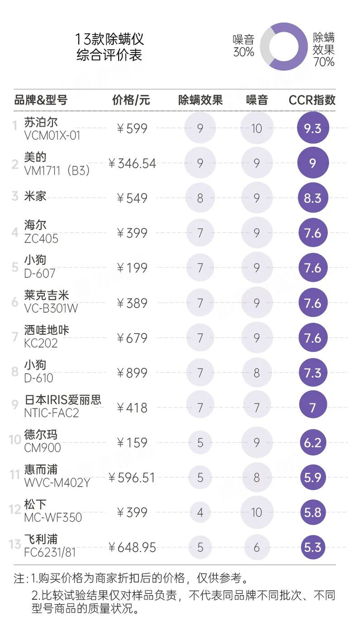 因为部分除螨仪没有搭载紫外线功能,部分为有线使用,不需要考虑续航,所以综合除螨效果、噪音这2项指标,得出13款除螨仪的综合评价。