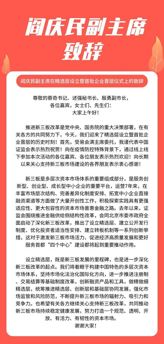 今日,证监会副主席阎庆民在精选层设立暨首批企业晋层仪式上的致辞。阎庆民在仪式上肯定了新三板的作用,表示新三板是多层次资本市场体系的重要组成部分,是服务创新型、创业型、成长型中小企业的成长平台,在丰富市场层次结构、完善市场差异化安排、拓宽中小企业直接融资渠道方面做了大量开创性工作。
