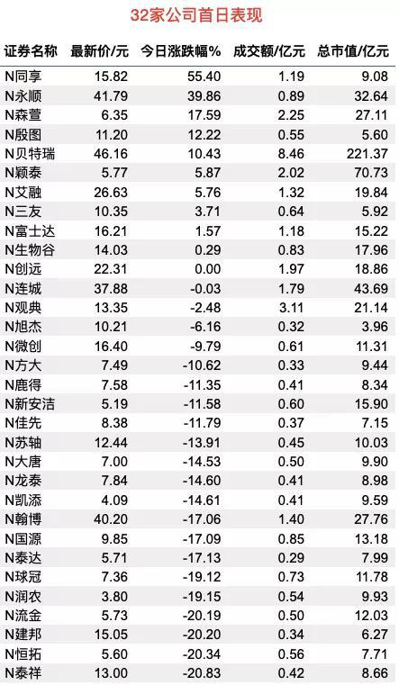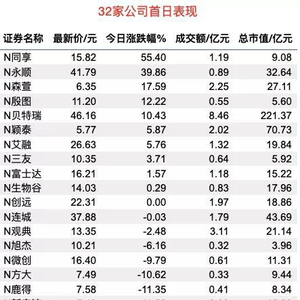千呼万唤始出来,新三板精选层今日开板,32家公司在精选层挂牌交易。从首日市场表现来看,收盘后,32家公司有10家股价上涨,N同享上涨涨55.4%表现最佳;1家平盘,21家公司股价下跌,N流金等4家公司股价下跌超20%。