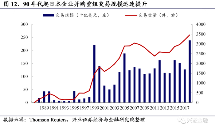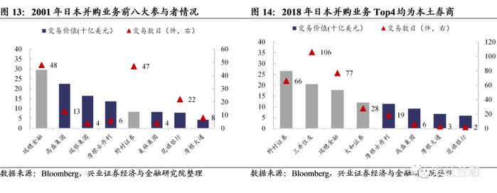 (3)在并购重组业务方面,外资券商凭借跨境资源优势占据一席之地。90年代以前日本企业并购重组交易量较低,规模不超过500亿美元。随着日本泡沫经济破灭、政府管制放松及经济自由化政策的推动,90年代末日本企业兼并包括跨境并购交易开始快速增长。并购重组交易规模从1991年的仅86亿美元迅速提升至2000年的1396亿美元,其中跨国并购交易占比32.5%。外资券商由于在全球并购经验、总规模及单笔交易规模方面均具有极强的竞争力,使得日本本土券商黯然失色。2001年日本并购业务参与者Top8中日本本土券商仅瑞穗金融和野村证券两家,总交易价值分别为296/83亿美元,市场份额分别为41%/12%;而外资券商高盛、瑞银和摩根士丹利市占率分别达31%、23%和19% 。