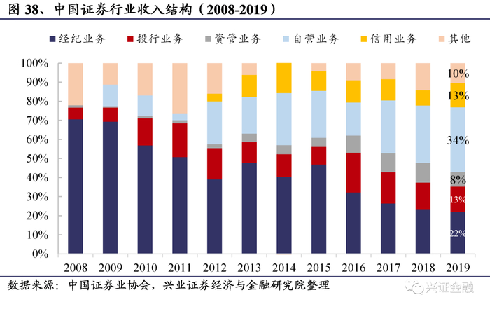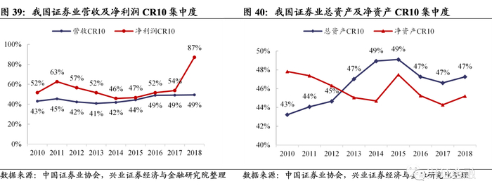 我国证券业持续推进转型升级,头部集中格局日益凸显。近年来,我国证券行业收入结构不断调整,经纪业务占比持续下降,从2009年的69.2%下降至2019年的21.9%,,稳步推进传统零售业务向财富管理转型。投行业务整体占比较为稳定,维持在15%左右;资管、自营和信用业务占比持续提升,2019年三项业务占比分别为7.6%、33.9%和12.9%。此外,证券业头部集中格局日益凸显,2010-2018年我国行业总资产CR10从43%提升至47%,净资产CR10稳定在45%左右;营收CR10从43%提升至49%,净利润CR10维持在50%以上。叠加监管层扶优扶强的思路及打造航母级券商的诉求,预计头部券商的综合服务能力将持续加深,证券行业集中度再次进入上扬周期。