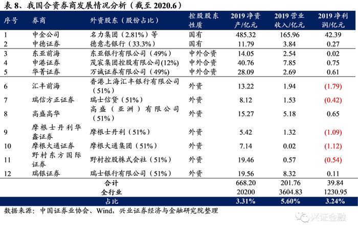 牌照限制逐步放开,我国外资券商正处于起步阶段。截至2020H1共有中外合资券商5家、外资控股券商7家,2019年合资券商营收合计为201.76亿元,占比证券全行业营收5.60%;净利润为39.84亿元,占比3.24%;净资产为668.20亿元,占比3.31%。合资券商盈利表现平平,除中金公司外,其余2019年净利润均在行业60名之外,且其中5家仍处于亏损状态,究其原因主要系:1)前期外资券商受牌照和持股比例限制,无法与本土券商开展全业务领域的竞争。自1995年起外资券商逐步进入国内市场,然而大部分外资券商仅持有证券承销及保荐业务牌照(投行业务),业务开展大幅受限。直至2018年证监会对外资券商牌照审核趋于放松,外资才陆续获得经纪、自营、资管等业务牌照。2)国内监管政策资源向本土大型优质券商倾斜,驱动龙头券商强者更强。