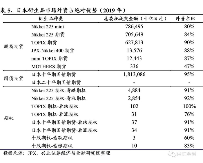 凭借丰富经验,外国投资者占据日本衍生品市场大壁江山。1988年开始进行股指期货交易之后,外资与内资机构同时允许进入市场交易,而外资机构拥有更为丰富的投资策略和多元化的风险管理模式,对于衍生品交易存在较大的刚性需求。因此外国投资者踊跃参与日本期货交易,交易份额不断提升,股指期货交易量份额从1988年的仅1%,提升至1992年的10%,而后一直保持快速增长趋势,直到2014年超过70%[1]。根据日本交易所集团(JPX)数据可知,2019年日经225期货和日经225mini期货外资交易量份额分别达84%、80%;国债期货外资交易量占比达63%,外资的积极参与成为推动日本衍生品市场发展的强大动力。