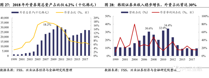 外资券商进入韩国市场后,营收占比一度超30%,整体盈利能力较强。自90年代韩国资本市场全面开放起,证券业进入到蓬勃发展期,总营收从1999年的11.6万亿韩元大幅增长至2008年的44.3万亿韩元,CAGR达16%。在此期间,外资券商营收占比从11.5%上升至30.6%,净利润占比从10.3%迅速提升至近50%,总资产占比最高达18.2%。而后受2008年全球金融危机及2011年欧债危机影响,韩国资本市场出现调整,外资券商收入占比大幅下降。截至2018年,韩国证券业收入达80.4万亿韩元,外资占比9.6%;净利润5.4亿元,外资占比15.1%;总资产438.7万亿韩元,外资占比仅6.2%,可见外资券商相比本土券商在营收和资产规模占比上并不具有优势,但整体盈利能力较强。