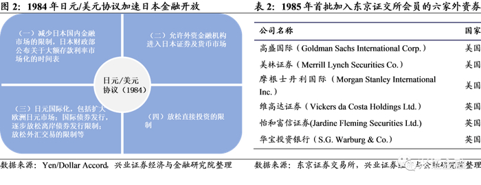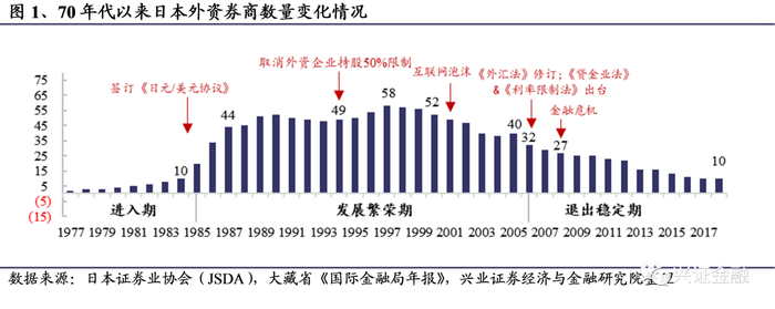 1984年美日签订“日元/美元协议”,推动日本证券业加速开放。1971年日本制定《外资证券公司法》允许外国证券公司以营业部形式在日开展业务,是日本证券业对外开放的准入标志。1984年美国和日本特设日元/美元委员会签署了一项关于开放日本金融市场的协议,提出允许境外金融机构参与日本资本市场等方案,极大地推动了日本证券业的加速开放。随后1985年东京证券交易所(TSE)对6家外资券商开放会员权,1993年取消外资企业持股不超过50%限制,进入日本市场的外资券商数量显著增长,从1984年仅10家快速增长至1997年末的58家,营收占比达32%,成为日本金融业重要一环。