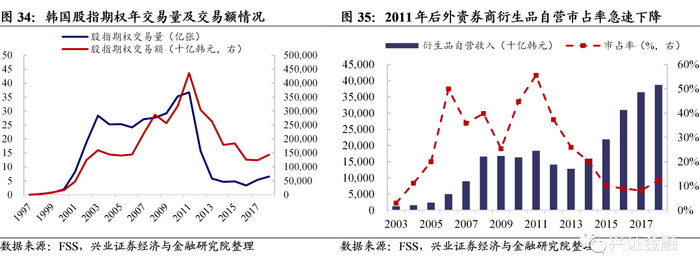 1)衍生品自营业务方面,外资券商市占率一度达到30%-50%。1996年韩国推出股指期货,1997年便开发上市KOSPI 200股指期权,受益于合约设计投资门槛低、交易成本少等因素得以迅猛发展。1998年7月韩国衍生品交易对外国投资者开放,吸引众多国际资本进入韩国资本市场,股市强劲复苏。股指期权年交易量从1998年的0.32亿张快速增长至2010年的35.26亿张,约占比全球股指期权年交易量的42%,在此期间外资券商衍生品自营业务的市场份额曾最高达50%。但从2011年起,韩国监管部门为抑制过度投机交易对股权类衍生品严格管制,流动性急剧萎缩。同时大量外资机构因业务违规如衍生品业务外包、跨市场操纵KOSPI 200股指期权受到韩国监管机构处罚,衍生品业务开展受到限制。2011年后外资券商的市场份额急速下降,占比仅维持在10%左右。
