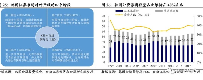 韩国证券市场开放经历了四个阶段,直至1998年允许外资设立全资证券公司。20 世纪80年代初,为改变石油危机导致的韩国经济急剧下滑局面、缓和经常项目大量逆差和沉重的外债负担,韩国政府在1981年出台《资本市场国际化计划》,开启证券市场的国际化进程。韩国证券市场对外开放主要分为四个阶段,经历了由间接开放到有限度直接开放,再到完全开放的渐进过程。1981年允许外资券商在韩国设立代表处,1990年允许设立分公司与合资券商,直至1998年允许设立全资证券公司,取消对外国投资者证券投资和证券经营机构的所有限制。自此外资在韩国证券市场中快速发展,数量占比35%-45%,整体保持稳定。截至2019年末,韩国共有证券公司56家,其中外资券商22家,占比高达39.3%。