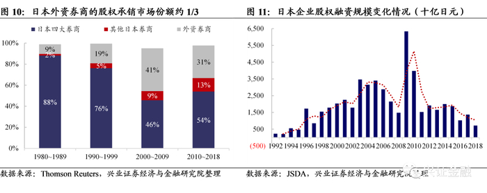 (2)在股权融资方面,外资券商市场份额约占到三分之一。80年代外资券商股票承销的市场份额只有9.1%,伴随着日本直接融资占比的迅速提升及海外融资的需求(如日本证交所总市值Top1的丰田汽车1999年赴伦交所上市,并在纽交所发行存托凭证;索尼先后于伦交所和纽交所发行存托凭证等),外资券商在90年代后期至全球金融危机前,也就是股权融资规模较大的时候市场份额不断上升,于21世纪初达到顶峰,市场份额约40%。而后随着企业股权融资规模持续下降,外资券商的优势略有消退,市场份额逐渐压缩至30.9%。