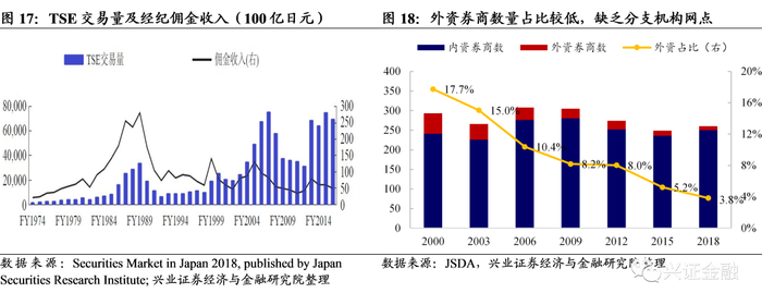 1)佣金率自由化和网络券商崛起压缩传统经纪业务利润空间。1998年12月日本监管改革使证券公司的许可系统转换为注册系统,并在1999年10月完全放开了经纪佣金,此后至金融危机前日本股票市场日均交易量不断攀升,而佣金收入却出现下降。与此同时随着2002年网络券商的加入,日本传统佣金率进一步下滑,在传统券商佣金率仍保持在0.8%的情况下,网络券商以仅0.04%的佣金率迅速吸引了大批客户资源,抢占市场份额。据日本证券业协会统计,1999年网络经纪账户约30万户,到2017年已经增长至约2380万户。