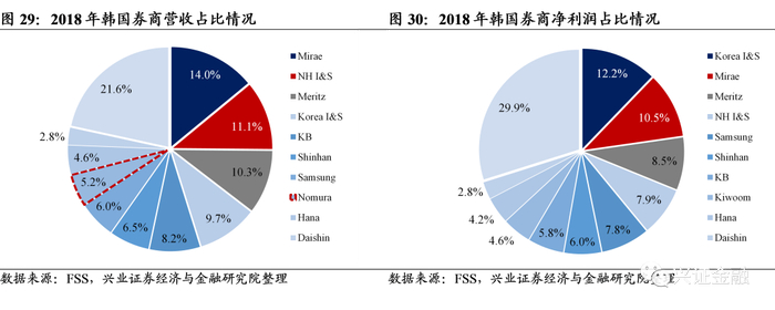 竞争格局:行业集中度低,核心主导为本土券商。与日本高度集中的竞争格局不同,韩国证券业行业集中度较低,竞争性大。从营收角度来看,2018年前十大券商占据78.4%的市场份额,前三大券商均为韩国本土券商,分别是未来资产证券(11.3万亿韩元,14%)、NH投资证券(8.95万亿韩元,11.1%)和梅瑞兹证券(8.3万亿韩元,10.3%)。野村证券是唯一进入前十名的外资券商,营收为4.2万亿韩元,占比5.2%。从净利润来看,前十大券商均为本土券商,CR10为70.1%,CR3为31.2%,分别是韩国投资证券、未来资产证券和梅瑞兹证券。综上所述,韩国证券市场较为分散,行业核心地位由本土券商掌控,外资券商进入并未改变行业整体格局。