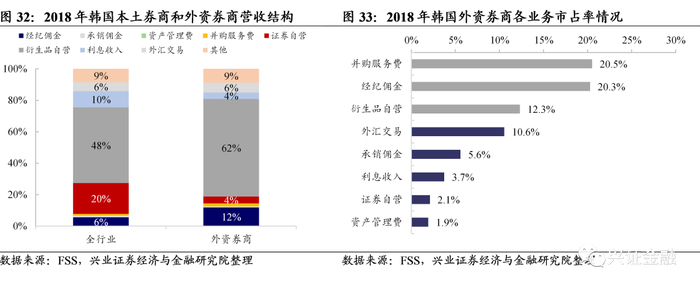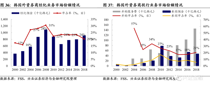 2)经纪及投行业务方面,外资券商经纪业务市占率达20%-25%,并购业务占比20%-30%。外资券商进入后经纪业务市场份额整体保持稳步增长的态势,从2000年的17%上升至2008年的31%,而后维持在25%左右。由于外资券商在分支机构网点方面逊色于本土券商,推测其经纪业务主要集中于需要较高研究能力和资产配置能力的财富管理业务。投行业务方面,股债承销、跨境并购业务一直是海外大型投行的优势,其中外资券商承销业务市占率最高达17%(2010年),并购业务市占率最高达57%(2004年),随着本土券商短板补齐,外资券商的优势逐渐消退,截至2018年承销佣金和并购服务费市场份额分别为6%和21%,同时考虑到投行业务收入极低的营收占比基数,韩国证券行业核心地位依然为本土券商。