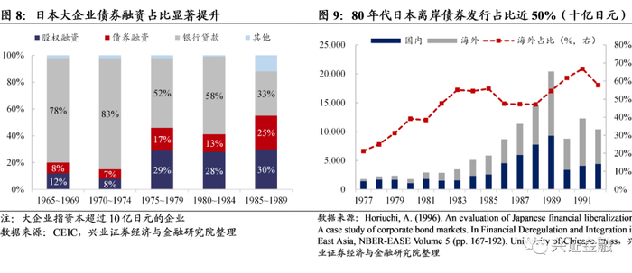 1) 债券发行条件放松推动优质企业债券融资占比显著提升。80年代之前日本企业融资结构以银行贷款为主,银行贷款融资占比超80%。然而1984年日元/美元协议签订后,欧洲日元债券市场放开,倒逼国内债券发行条件放松及发行成本下降,使得日本大企业的融资结构中债券融资占比显著提升,从70年代仅占比7%快速上升至90年代的25%。