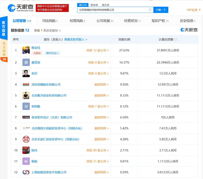 北京极简时代软件科技有限公司成立于2012年7月,注册资本约136.8万人民币,法定代表人为杨金钰,经营范围包括技术开发、销售计算机、软件及辅助设备、电子产品、通讯设备等。天眼查股东信息显示,杨金钰持有该公司27.63%的股份,为公司最大的股东;北京顺为创业投资有限公司(雷军持股51%)仍持有该公司约8.12%的股份,为该公司第五大股东;其余股东还包括汤臣倍健、真格基金等。