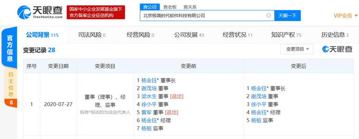 天眼查数据显示,近日,北京极简时代软件科技有限公司发生工商变更,雷军退出该公司董事行列,一同退出的还有梁水生。