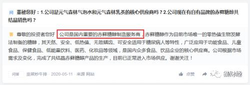 目前,保龄宝方面还并未明确公开表示自己是否是元気森林、奈雪等品牌赤藓糖醇的核心供应商,在深交所互动易上,对于投资者的相关提问,保龄宝也只是含糊表示“公司是国内重要的赤藓糖醇制造服务商”。