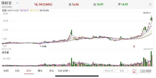 而保龄宝(002286.SZ)作为国内赤藓糖醇生产龙头企业,自7月10日以来已经收获7个涨停板,市值最高增长29.67亿,7月28日早盘低开5.82%,开盘价为15.2元。