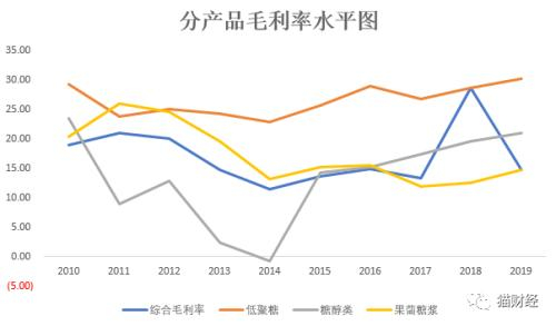 与此对应的是,保龄宝综合毛利率水平也在整体下滑,相较于2011年的峰值,2019年综合毛利率已下降至14.85%,同时,果葡糖浆等淀粉糖的毛利率也由26.13%下降至14.77%。