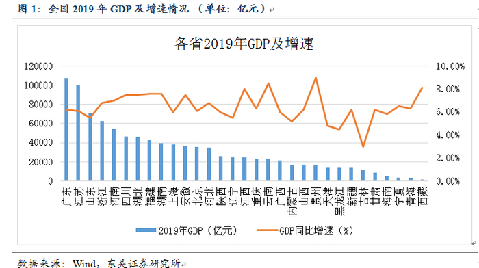 2019年江苏省GDP为99631.5亿元,名义增速为6.1%,三次产业结构调整为4.3∶44.4∶51.3;人均GDP为123607元,增长5.8%,GDP总量位列全国第二,仅次于广东省,经济体量大。19年固定资产投资增速保持稳定,同比增长5.1,其中项目投资增长3.2%,房地产投资增长9.4%。工业发展方面,高新技术产业投资增长23.3%。电子及通讯设备、计算机及办公设备、医药、仪器仪表制造业投资分别增长69.0%、23.7%、33.8%和79.5%。