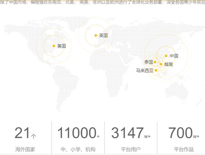 官网显示,编程猫已进驻国内4000多所中小学校,并且除了中国市场,编程猫在东南亚、北美、南美、非洲以及欧洲进行了全球化业务部署。2019年,编程猫开始实施“百城千店”计划,在全国100个城市设立1000个编程学习中心。