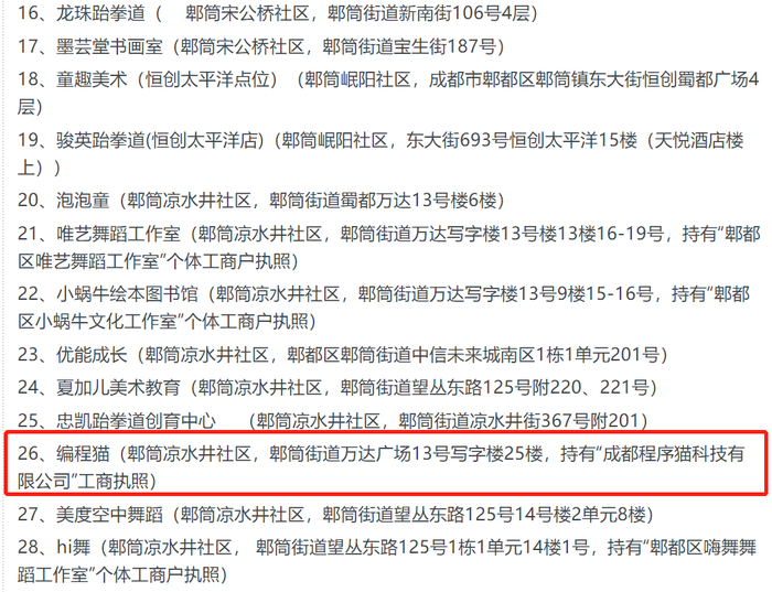 内容显示,前期摸排发现的无证无照或有照无证等不具备教育培训机构资质的382家机构名单,其中编程猫赫然在列,明确指出其线下门店无教学资质。郫都区教育局将对有照无证的校外培训机构,如具备办证条件的,指导其办证;如不具备办证条件的要责令其在经营(业务)范围内开展业务,整改合格前不得再开展相关教育培训业务。