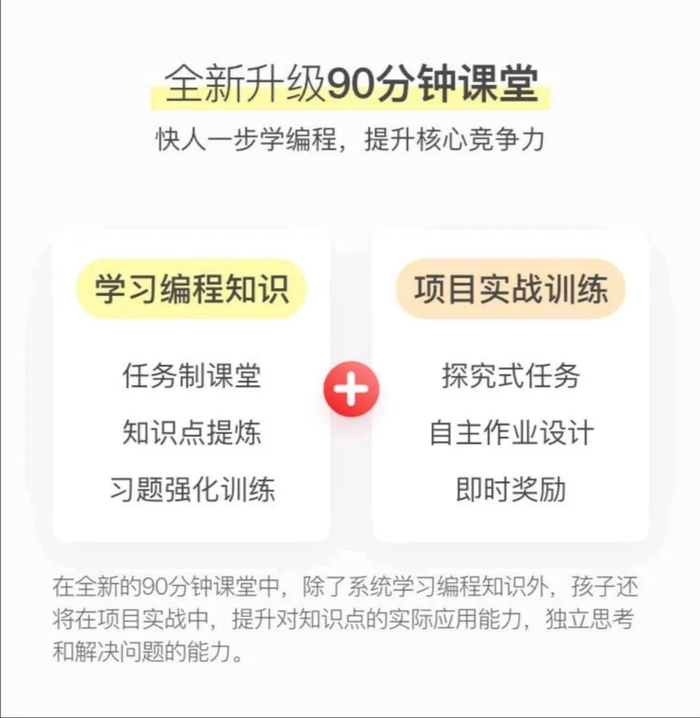 通过图形化编程课、python编程课的商品详情中可以看到,编程猫将90分钟的超长课程设置作为销售亮点,涉及编程学习与实践等多个环节。