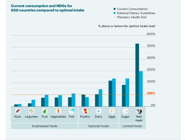 该报告首次以二十国集团(G20)为研究对象,认为G20中的部分成员国民众红肉、乳制品消耗激增的饮食模式,非常不利于地球的可持续发展。报告作者之一洛肯(Brent Loken)表示:“当前很多国家的民众遵循了错误的饮食体系,导致地球为此付出了不小的代价。”